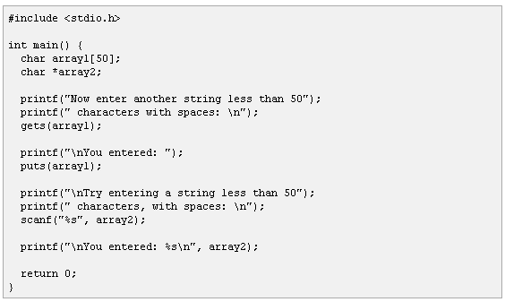 One possible way to read in a string is by using scanf. However, the problem with this, is that if you were to enter a string which contains one or more spaces, scanf would finish reading when it reaches a space, or if return is pressed. As a result, the string would get cut off. So we could use the gets function